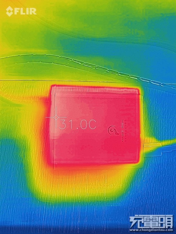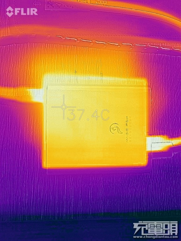 再来测一下USB-C1接口100W满载15分钟的温度,输入为19.5V/5.2A,输出为19.7V/5A,测试仪器为FLIR ONE PRO热成像仪,