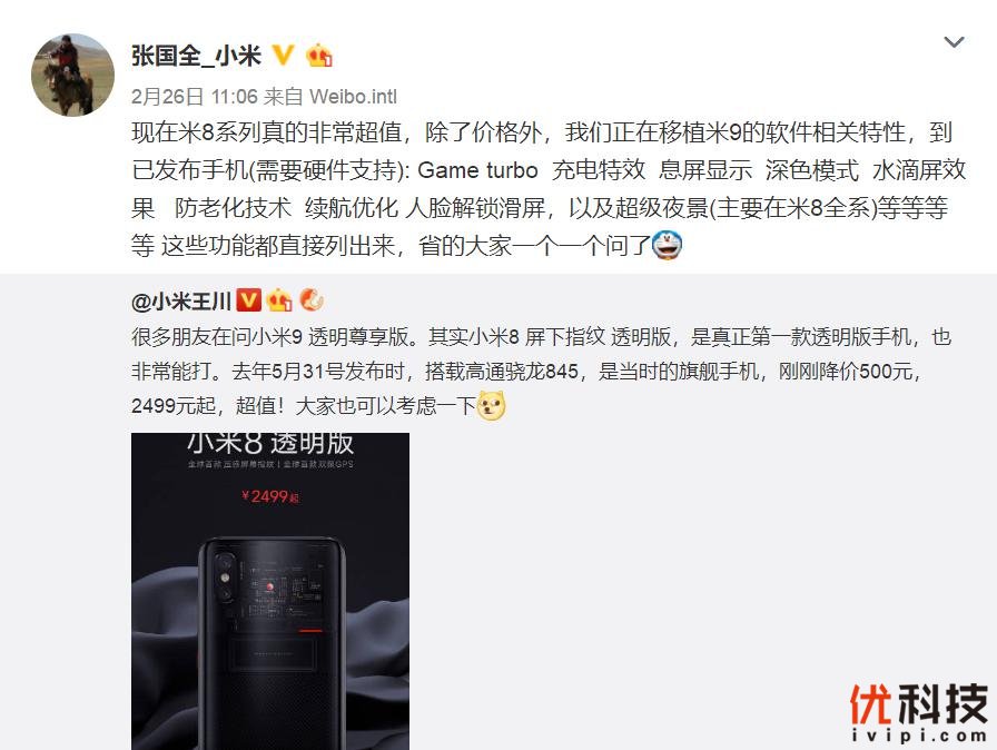 MIUI一直都是一个活的手机操作系统,此次除了为小米9保价护航外,许多重磅功能也会在后续更新适配到小米8全系手机中。据小米公司系统软件部负责人张国全表示,“Game turbo、充电特效、息屏显示、深色模式、水滴屏效果、防老化技术、续航优化、人脸解锁滑屏,以及超级夜景等功能都会为小米8适配。”MIUI在系统优化和功能适配上无愧“业界良心”标杆。