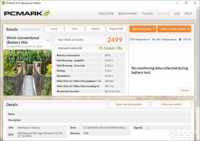 再来看看PC MARK测试下的续航表现,联想小新14锐龙版在高负荷运转下,实测拥有7小时56分钟38秒的续航表现。这样的成绩是相当不错的,如果将联想小新14锐龙版屏幕亮度调节为中等,并启用Windows10自带的节电模式,那么可以实现10小时的超长续航。