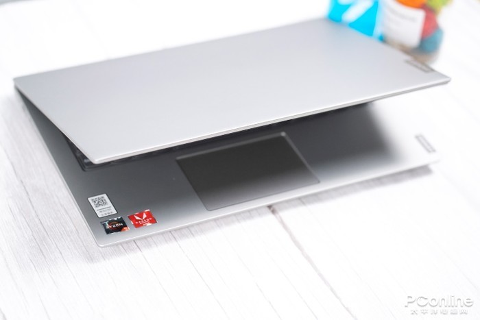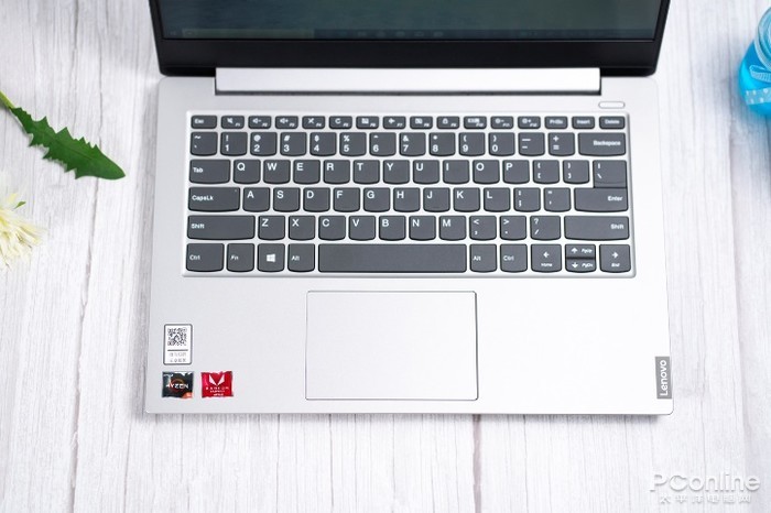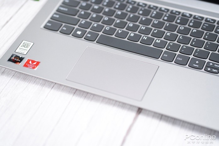 宽大的触控板不仅有亲肤触感的涂层,还支持Windows PTP驱动,允许三指/四指手势控制。用户能够不借助鼠标的帮助,实现在高铁上、飞机上等场景下的高效办公。在掌托的左侧,AMD Ryzen5处理器和AMD RADEON 核显的贴纸非常醒目。掌托右侧则印有联想全新的竖式LOGO。这种在掌托处印LOGO的设计,除了联想别无分舵了。