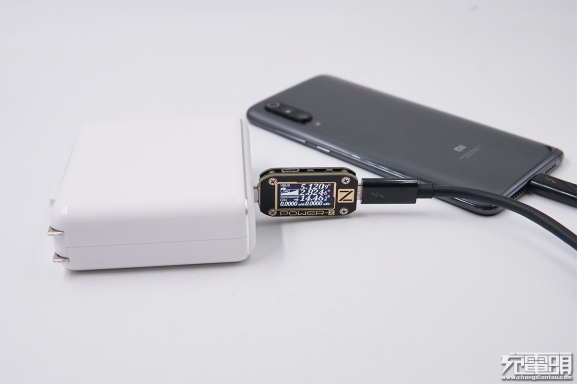 USB-C输出接口充小米9,电压5.12V,电流2.82A,功率14.46W,开启PD充电。