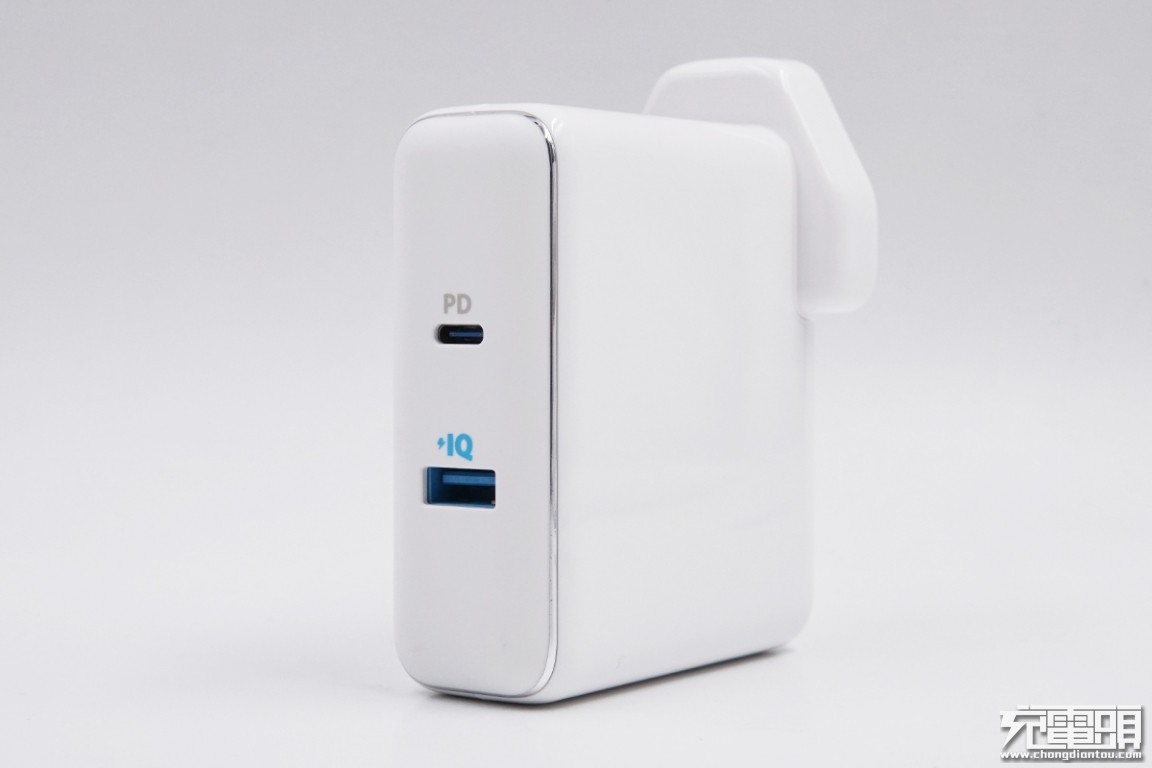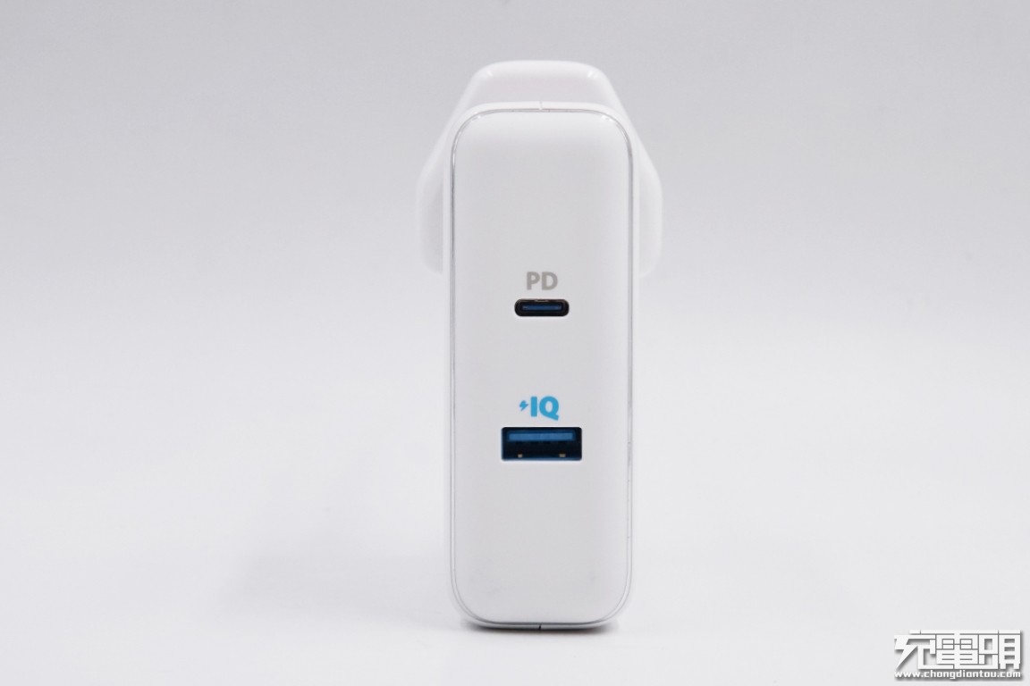 输出端配备了一个USB-C接口和一个USB-A接口,同时照顾到了新款和老款数码产品的充电需求。两个USB接口的舌片均呈蓝色,USB-C接口支持PD协议,标有银色PD文字。USB-A接口的上方印有“IQ”智能识别充电标志。