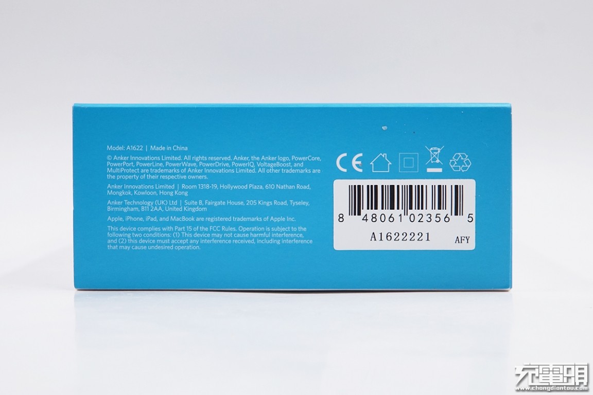 盒底有一些生产信息、品牌介绍等。这款超级充的型号为:A1622
