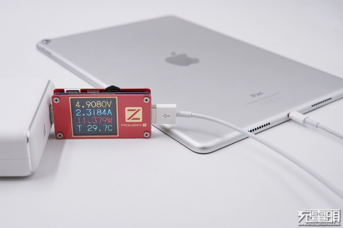 USB-A输出接口充iPad Pro 10.5英寸,电压4.9V,电流2.31A,功率11.37W,开启Apple 2.4A快充。