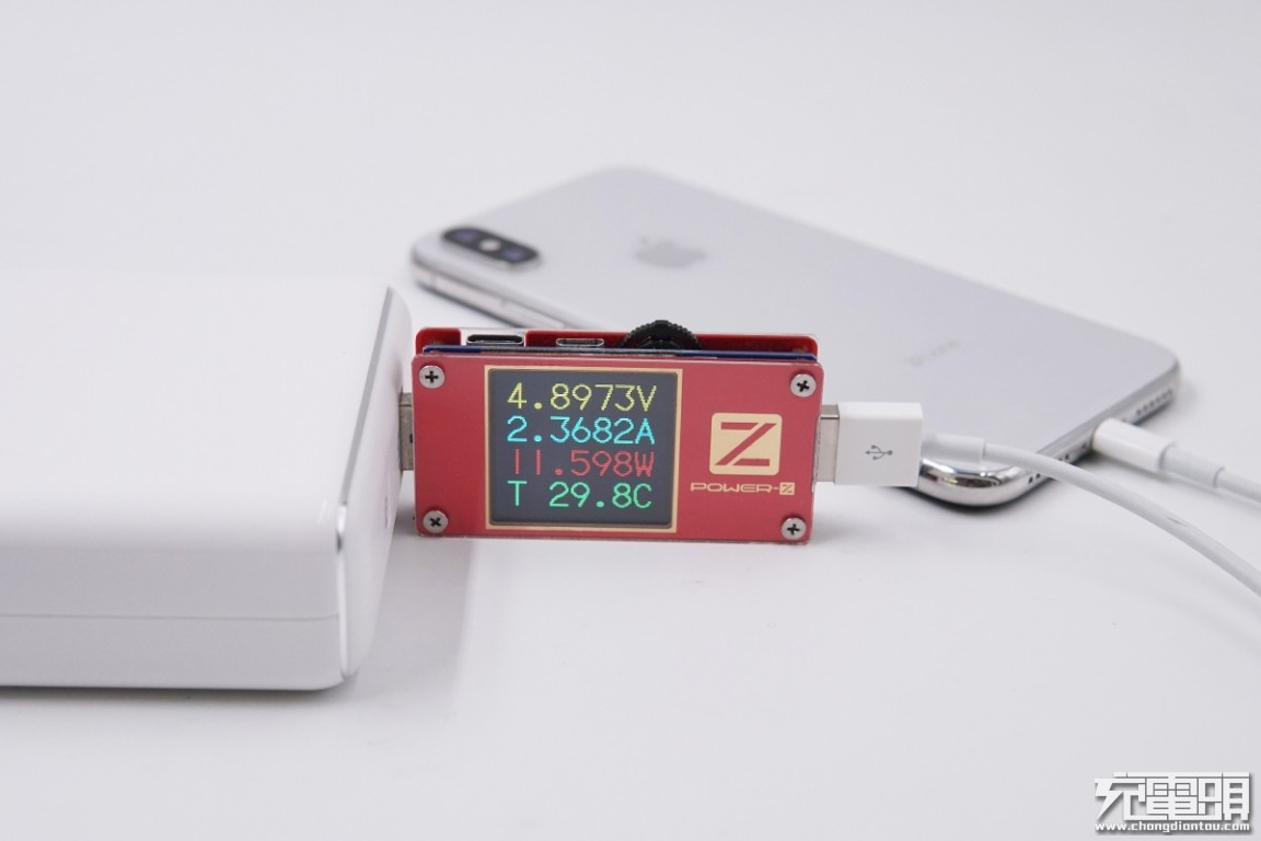 USB-A输出接口充iPhone X,电压4.89V,电流2.36A,功率11.59W,开启Apple 2.4A充电模式。