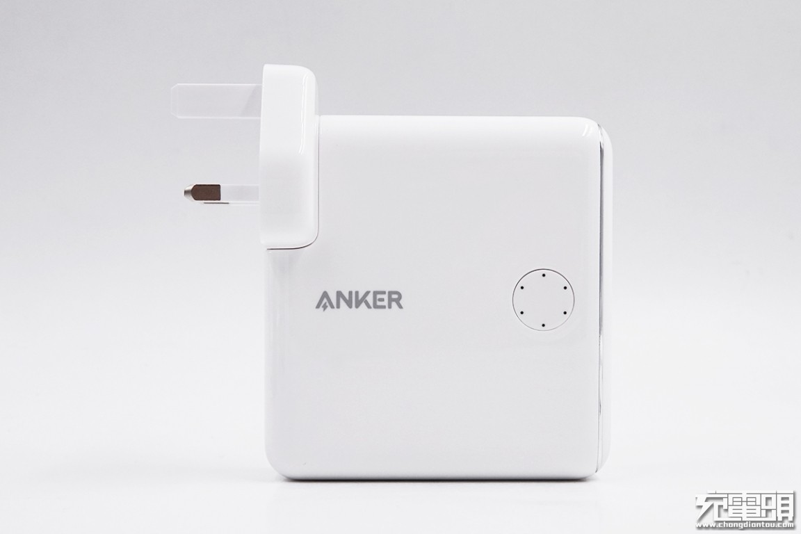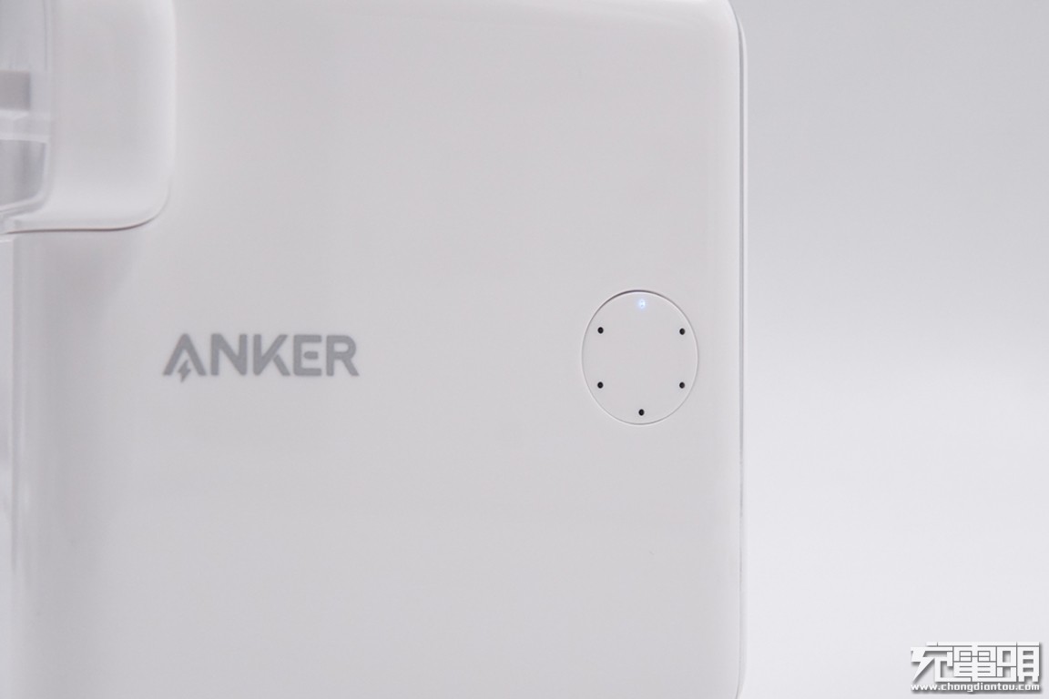 ANKER PowerCore Fusion Power Delivery超极充外壳为白色塑料,表面钢琴烤漆处理,手感光滑细腻,但同样的也是指纹收集器。正面镭雕银灰色“ANKER”的商标,右边圆形的是开关电源按键,轻按一下激活充电宝的输出。6颗LED灯环绕圆形键一周,可以指示移动电源的剩余电量,按下时依次点亮,动感十足。
