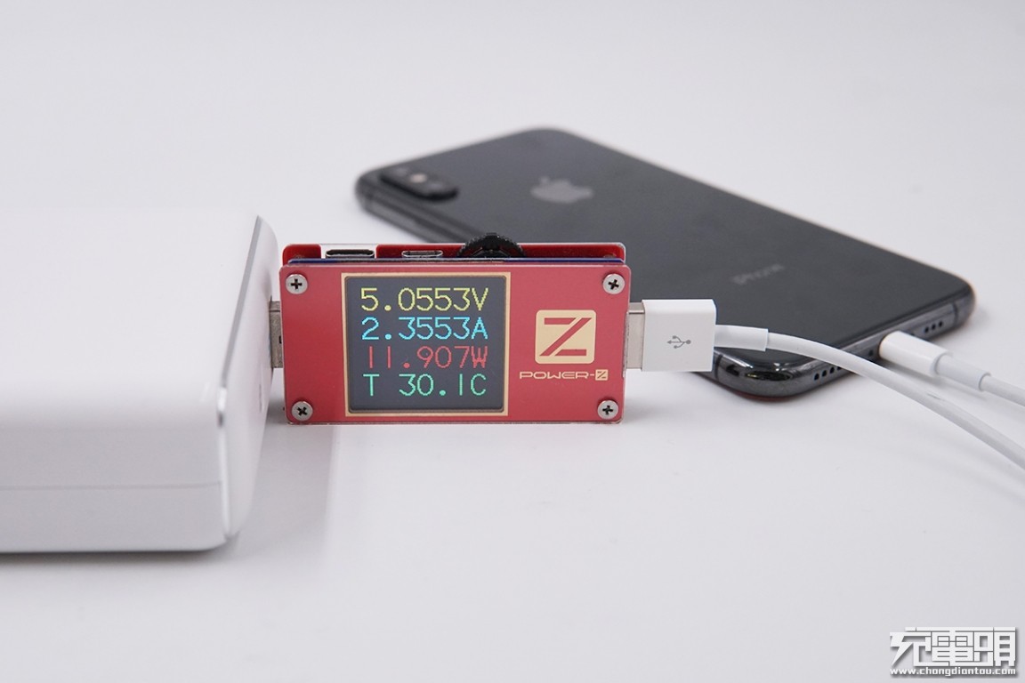 USB-A输出接口充iPhone XS,电压5.05V,电流2.35A,功率11.9W,开启Apple 2.4A充电模式。