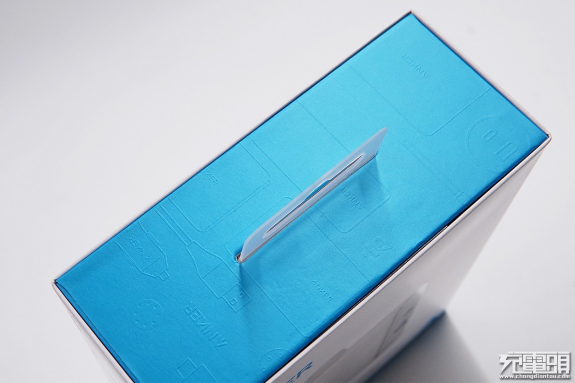 盒顶可以拽着挂钩抽来出来,顶面也有一些产品ANKER产品轮廓的压印图案。