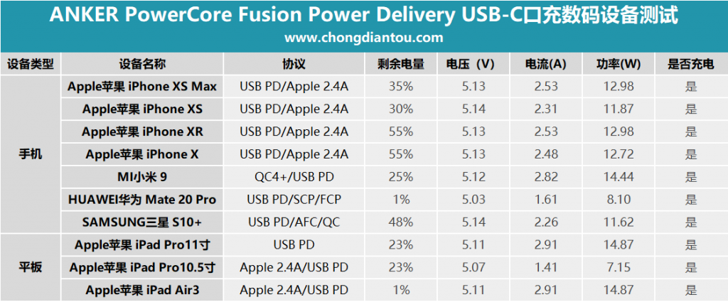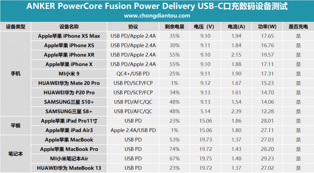 兼容性是测试一款充电产品必须经历的过程,它能最直观的给你答案:这款产品能不能给我的手机充电?能不能给我的平板充电?能充电的话是快充吗?接下来就跟着小编一起来看看ANKER PowerCore Fusion Power Delivery与市面上一些主流数码产品的兼容情况。