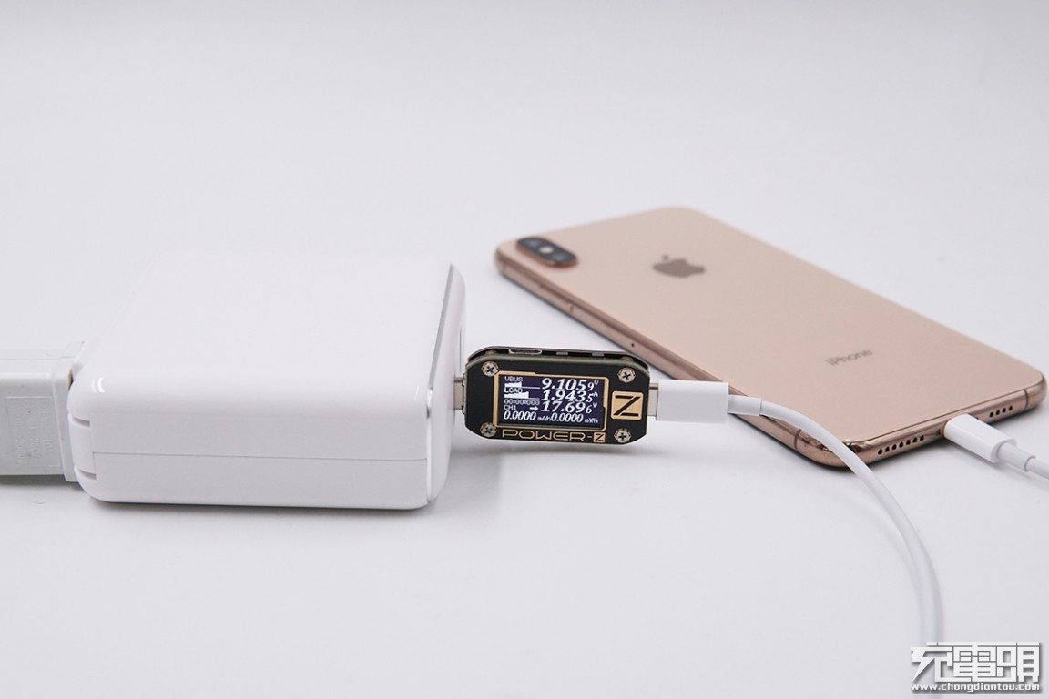 USB-C输出接口充iPhone XS,电压9.11V,电流1.84A,功率16.82W,开启PD快充。