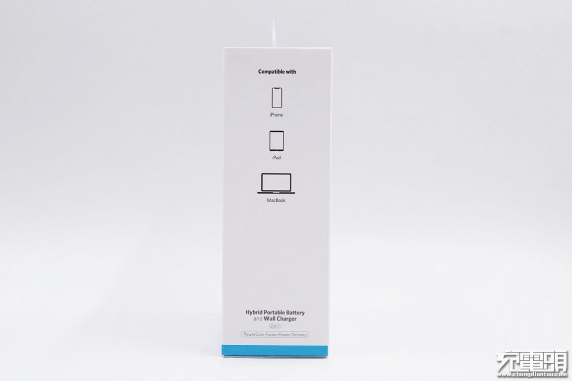 ANKER PowerCore Fusion Power Delivery超级充采用抽拉式纸盒包装,顶部的透明挂钩方便抽拉。包装盒采用白色基准色加蓝色点缀,一如既往的ANKER风格。充电器样图印制在包装盒正中央,可以直观的看到这款超级充有1A1C两个输出接口。下方还有一些产品的基本介绍。