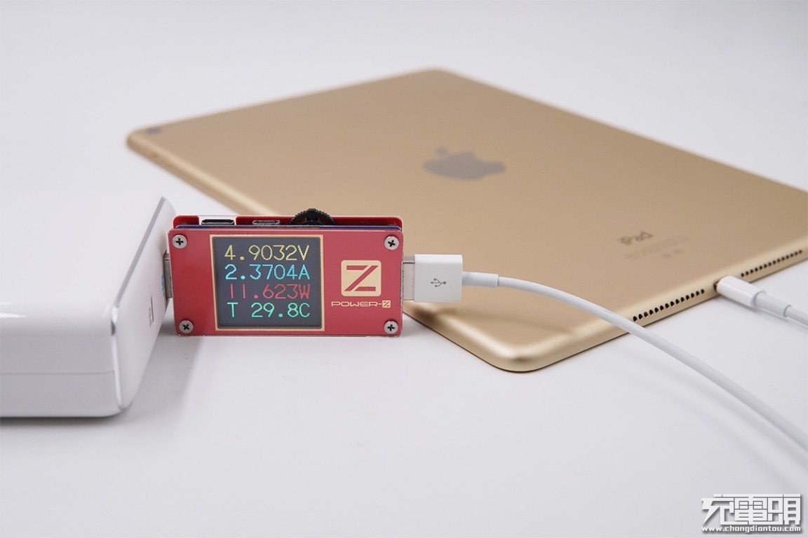 USB-A输出接口充iPad Air2,电压4.9V,电流2.37A,功率11.62W,开启Apple 2.4A快充。
