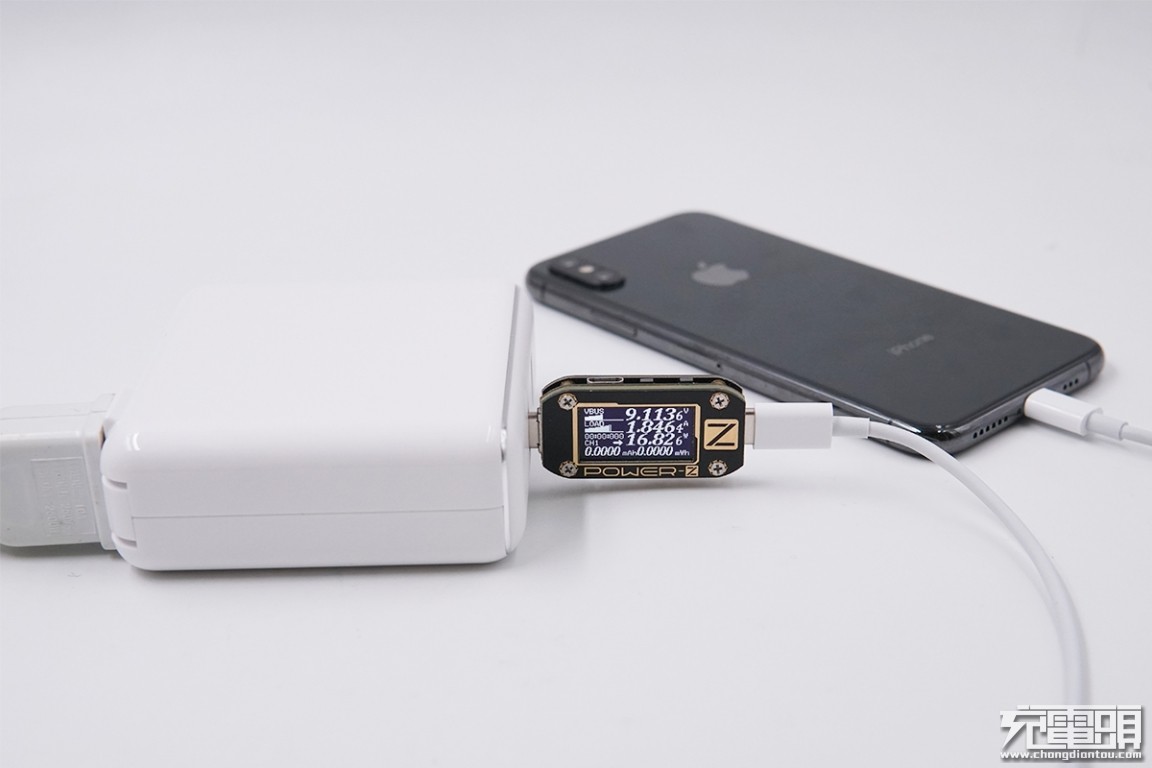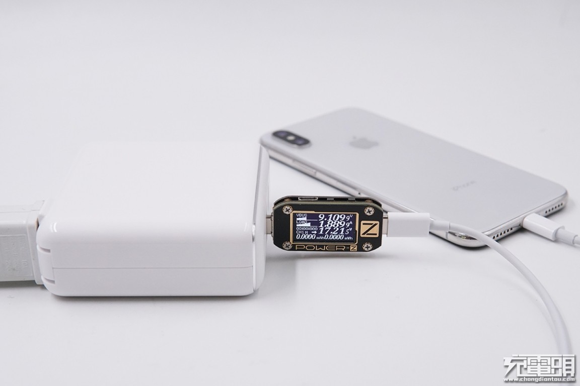 USB-C输出接口充iPhone X,电压9.1V,电流1.88A,功率17.21W,开启PD快充。
