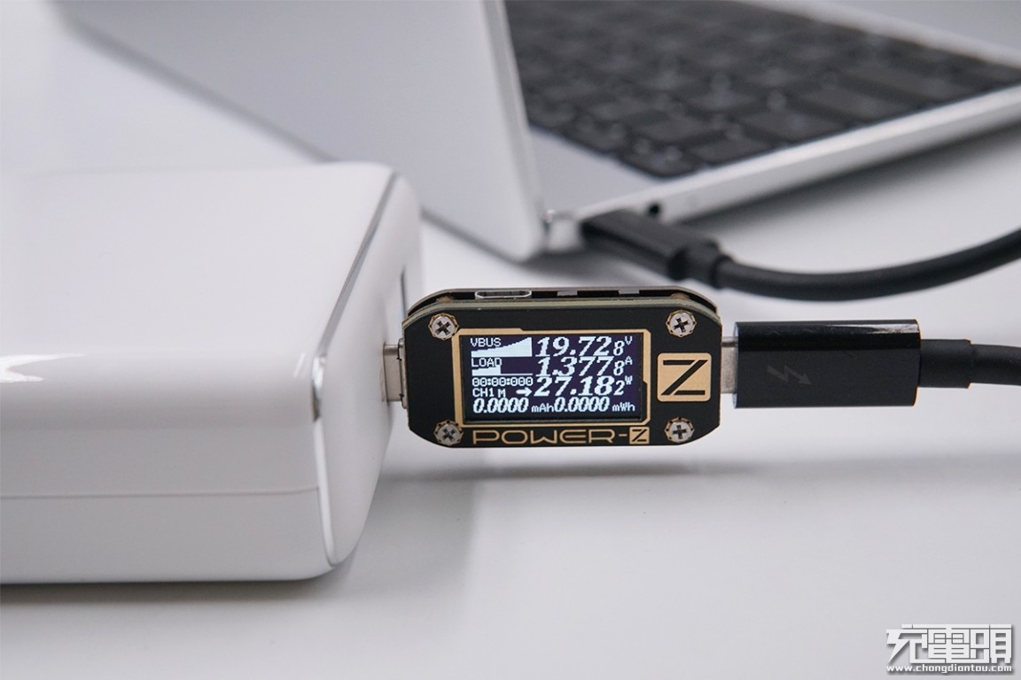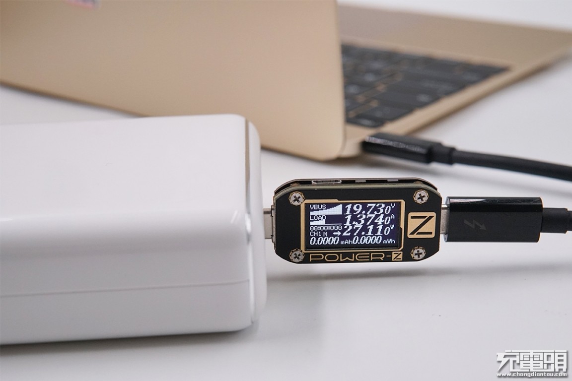 USB-C输出接口充MacBook,电压19.73V,电流1.37A,功率27.11W,开启PD快充。