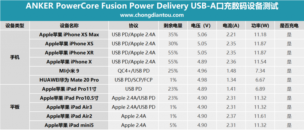 从表格上看,可以发现移动电源模式下的ANKER PowerCore Fusion Power Delivery USB-A口均能与支持Apple 2.4A协议的设备握手,兼容性不错,其余不几款不支持该协议的设备都以普通充电模式充电。
