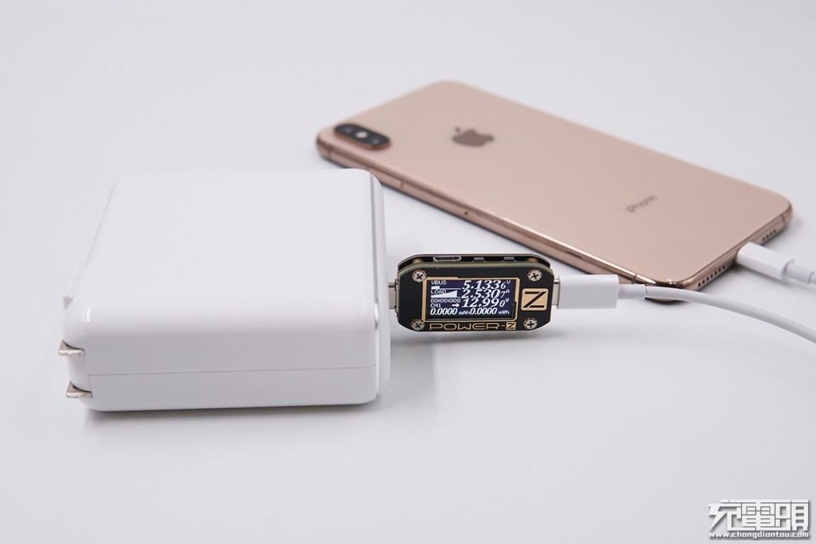 移动电源模式下,使用ANKER PowerCore Fusion Power Delivery的USB-C输出接口充iPhone XS Max,电压5.13V,电流2.53A,功率12.99W,开启PD充电。