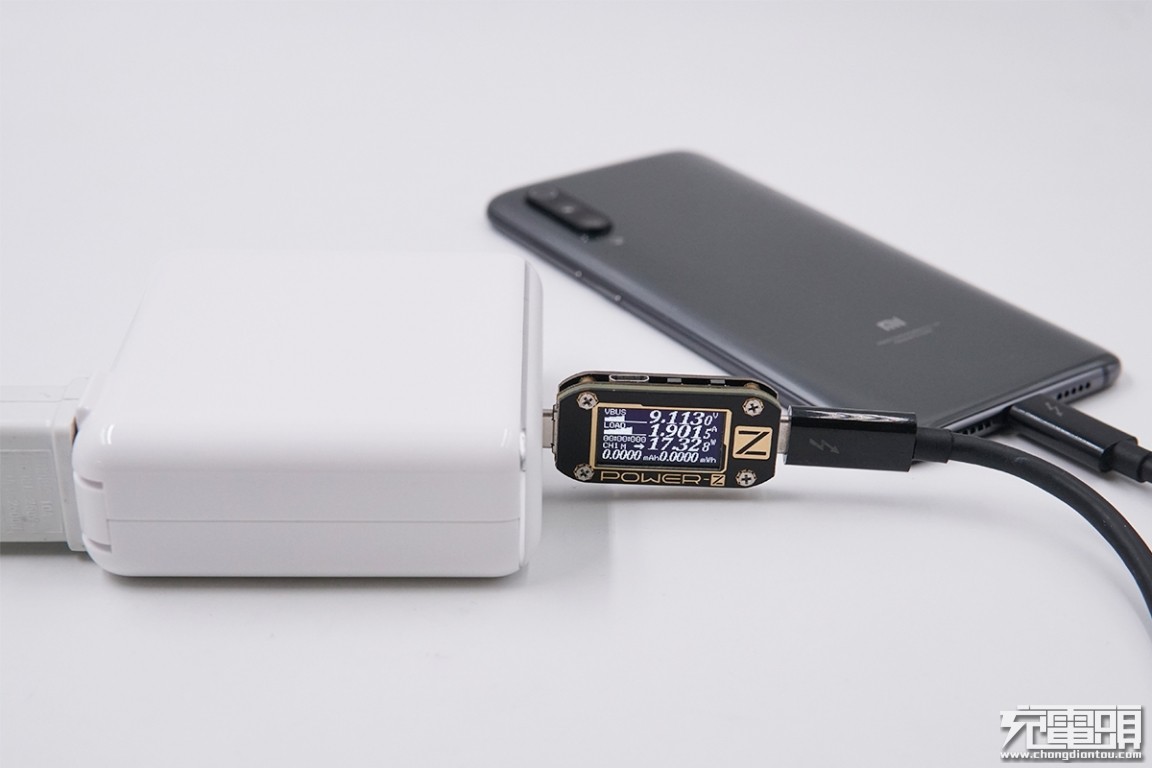 USB-C输出接口充小米9,电压9.11V,电流1.9A,功率17.32W,开启PD快充。