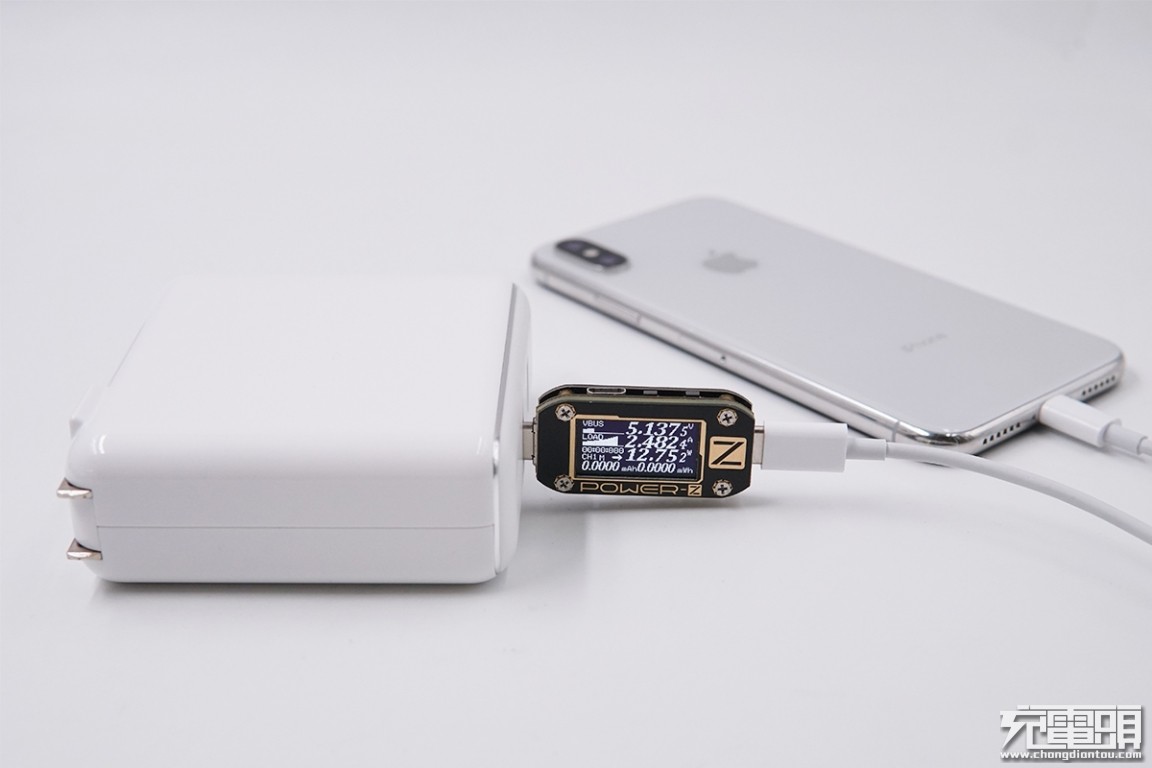 USB-C输出接口充iPhone X,电压5.13V,电流2.48A,功率12.75W,开启PD充电。