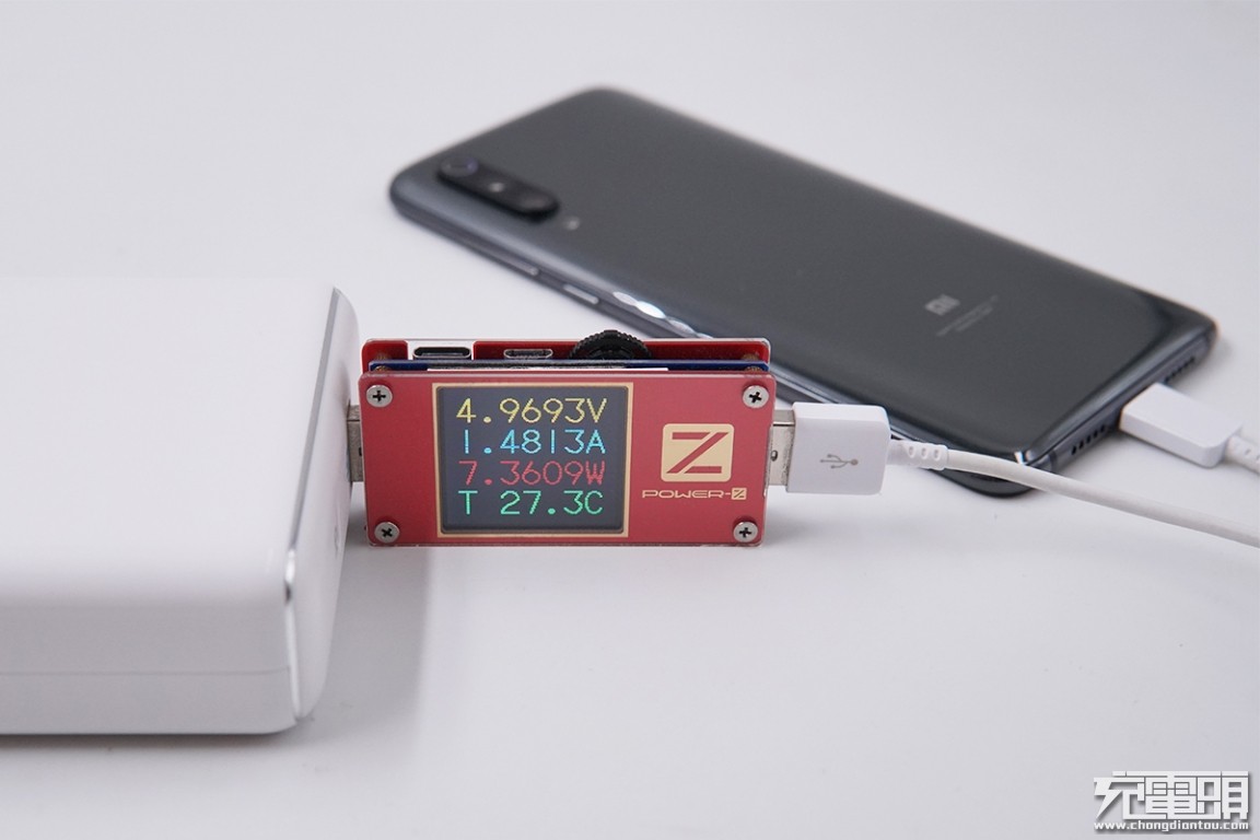 USB-A输出接口充小米9,电压4.96V,电流1.48A,功率7.36W,普通充电模式。