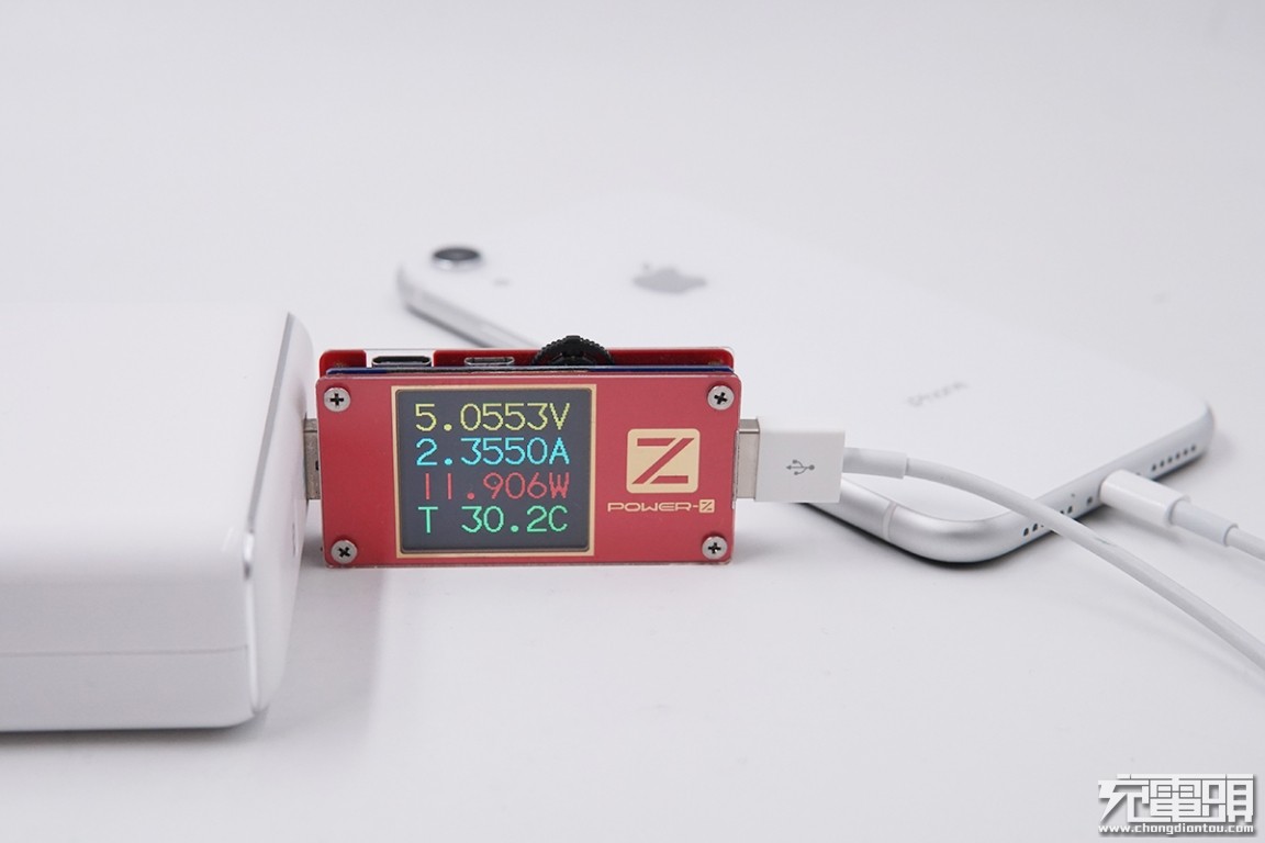USB-A输出接口充iPhone XR,电压5.05V,电流2.35A,功率11.9W,开启Apple 2.4A充电模式。