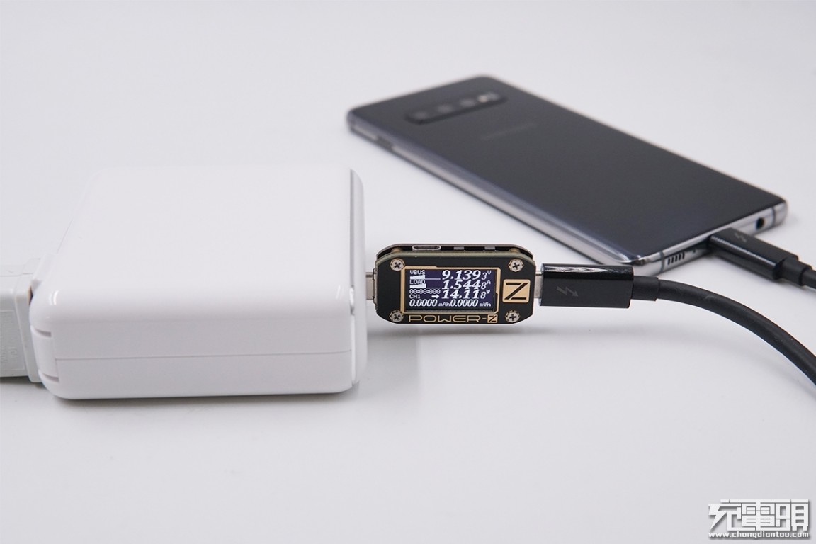 USB-C输出接口充三星S10+,电压9.13V,电流1.54A,功率14.11W,开启PD快充。