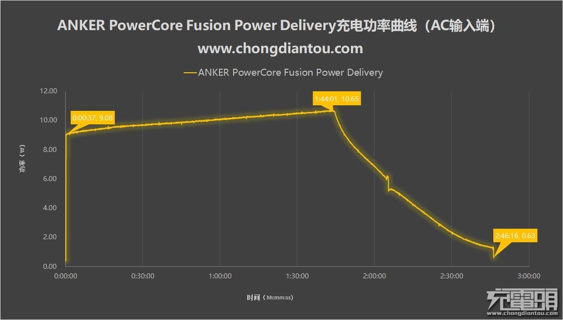 上图为功率曲线图,首先要注意的是该功率为ANKER PowerCore Fusion Power Delivery AC插脚输入端功率。从图中可以看出,充电一开启功率便达到了9.08W并且持续上升,在充电1小时44分钟时达到最高功率10.65W并开始下落,最后在2小时46分充电完成。从曲线来看,充电策略是常见的电池端CCCV策略。