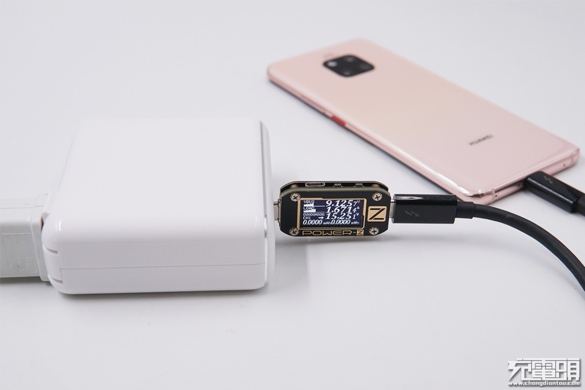 USB-C输出接口充华为Mate 20 Pro,电压9.12V,电流1.67A,功率15.25W,开启PD快充。