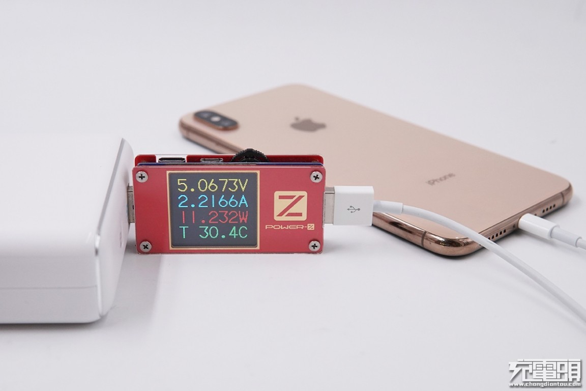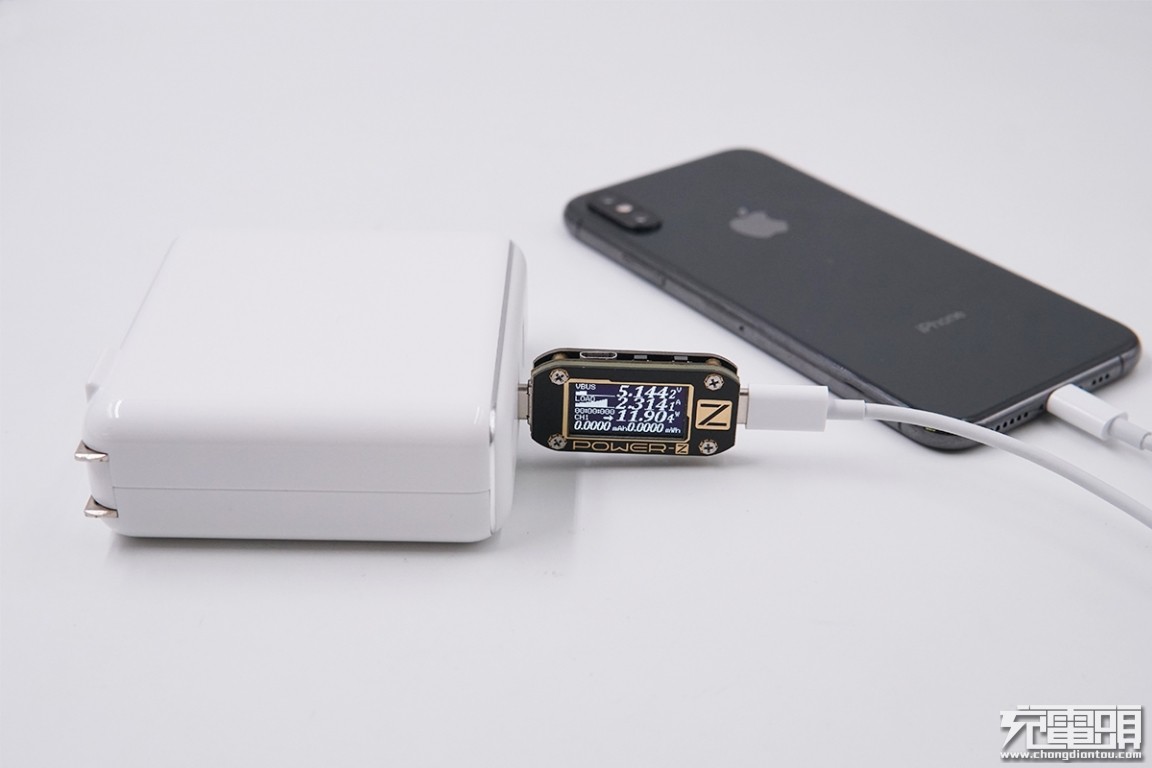 USB-C输出接口充iPhone XS,电压5.14V,电流2.31A,功率11.9W,开启PD充电。