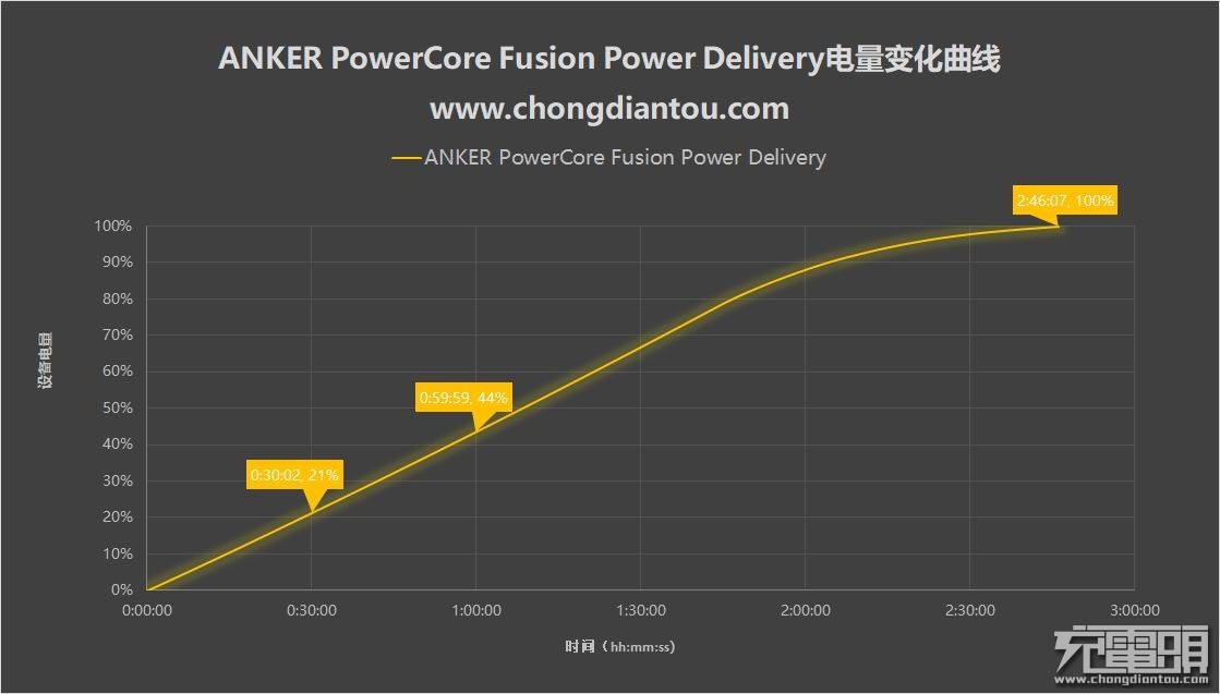 接着是电量变化方面,从上图可知ANKER PowerCore Fusion Power Delivery半小时可充21%电量,1小时可充44%电量,全程耗时2小时46分。