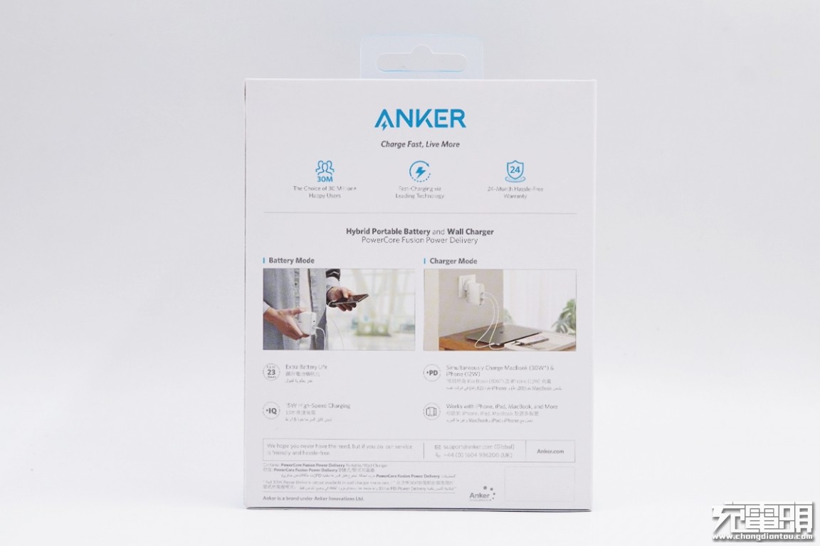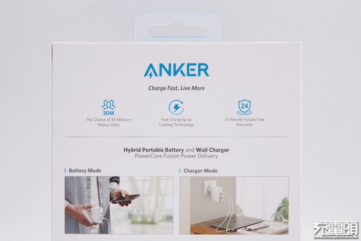 ANKER标志下方写有品牌slogen:快速充能,活得更精彩。还标有ANKER是3000万用户的选择、拥有领先的快充技术、24个月品质保证。