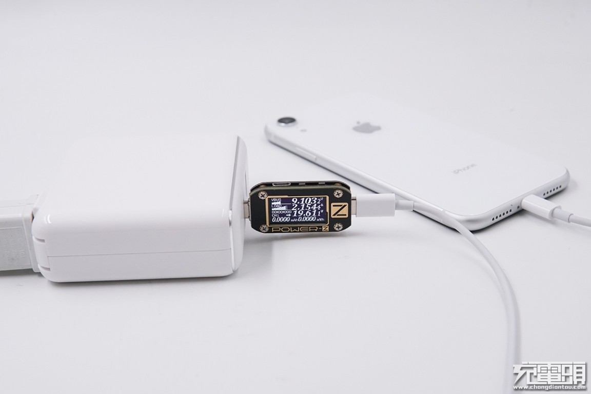 USB-C输出接口充iPhone XR,电压9.1V,电流2.15A,功率19.61W,开启PD快充。