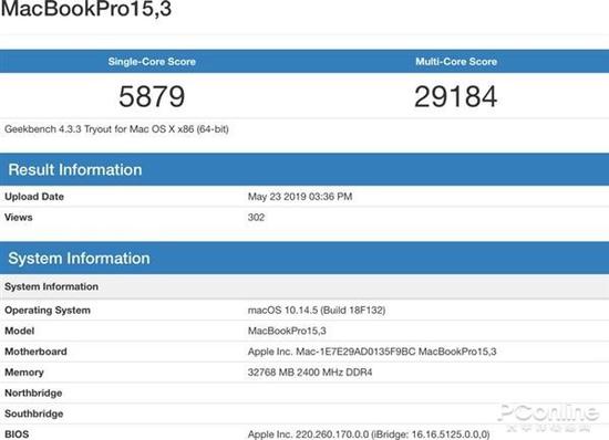 根据今天早些时候上传的跑分表可知,该设备搭载了一枚2.4GHz 英特尔酷睿i9八核处理器,单核成绩为5879,多核成绩为29184。