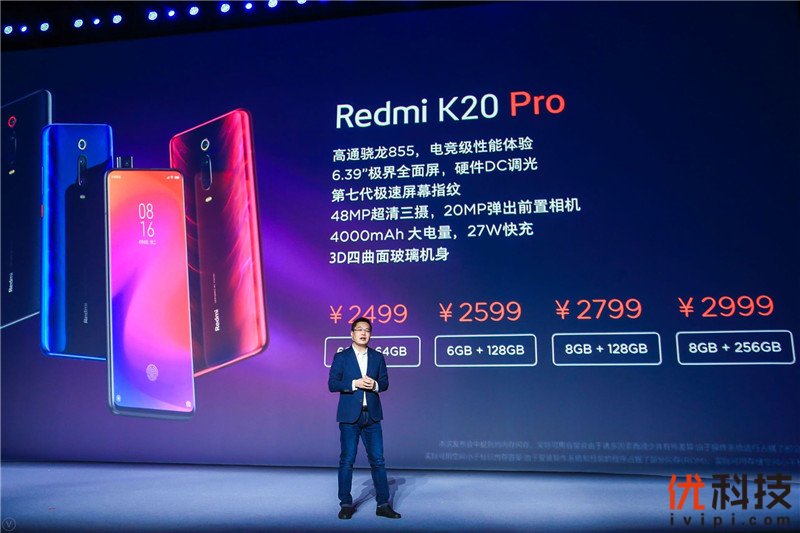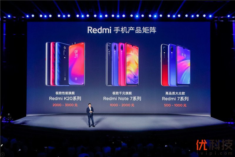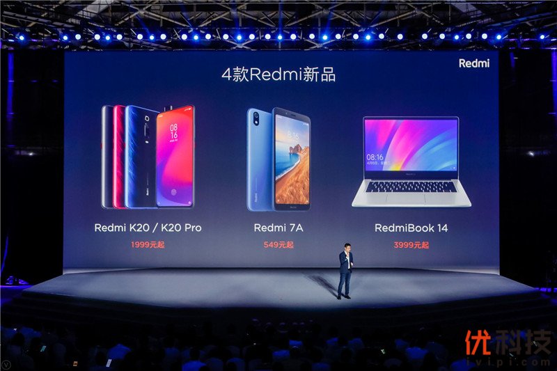 2019年5月28日,小米集团旗下品牌Redmi在北京召开Redmi旗舰新品发布会,小米集团副总裁、Redmi品牌总经理卢伟冰在发布会上正式发布Redmi真旗舰新品Redmi K20系列手机。其中,Redmi K20 Pro搭载高通骁龙855处理器、索尼4800万超广角三摄、升降式前置相机、AMOLED极界全面屏、第七代屏下指纹解锁、4000mAh超大电池和全曲面玻璃机身,2499元起的售价把极致性价比带到了性能旗舰机领域。一同发布的还有使用骁龙730处理器的Redmi K20售价1999元起、红米6A升级之作Redmi红米7A售价549元起和首款笔记本电脑RedmiBook 14售价3999元起,共四款新品。