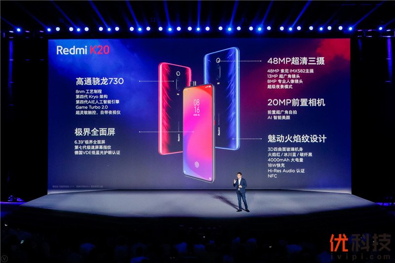 卢伟冰表示,K20 Pro的slogan是:真旗舰,敢K.O.,显示了对K20 Pro这款真旗舰手机旗舰性能与体验的信心。K20 Pro性能媲美电竞手机,使用高通骁龙855处理器,全新Game Turbo 2.0游戏加速技术,8层石墨立体散热相比iPhone X的单层石墨散热,散热能力提升650%。针对专业游戏玩家,还有K20 Pro定制游戏手柄可以选购。采用6.39英寸通过德国VDE低蓝光护眼认证的AMOLED极界全面屏,没有刘海、水滴屏的显示遮挡,3.8mm极窄下边框,屏占比高达91.9%。在业界率先采用真硬件DC调光,解决了低亮度频闪问题,而且不会有明显的色彩衰减。后摄4800万像素索尼IMX586主摄 + 1300万像素超广角 + 800万像素专业人像镜头三摄组合,具备相位及激光混合对焦。带优雅幻影光效的2000万像素升降式前置相机,超过30万次弹出寿命配蓝宝石镜头盖板,支持大广角全景合影。全新第七代屏下指纹感光面积增加一倍,指纹解锁速度大幅提升。最高8GB+256GB等多种存储组合,还有全功能NFC、双频GPS、3.5mm耳机插孔、超大音量外放扬声器、通过HI-RES audio认证,有线快充最高支持27W。