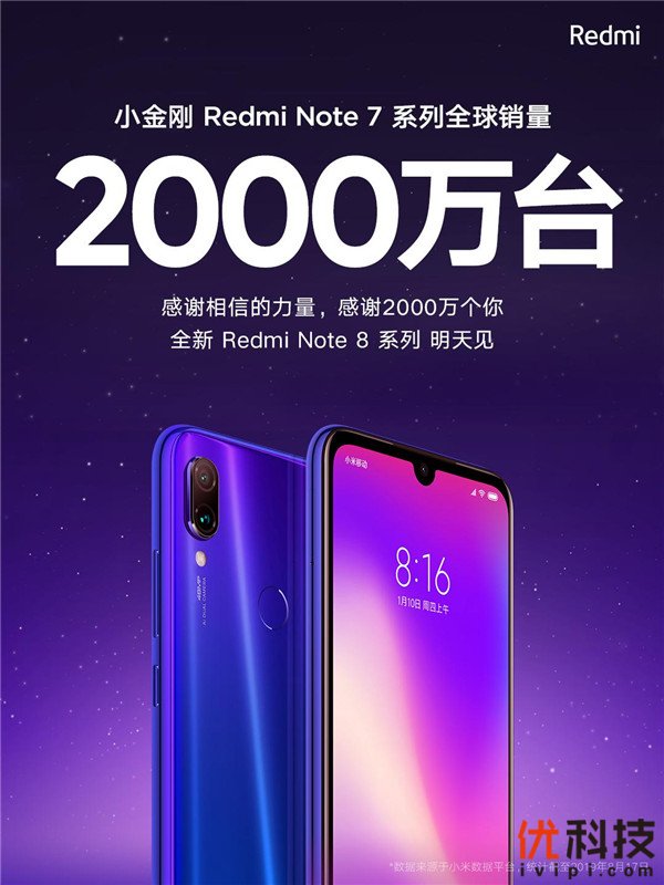 2019年8月20日,Redmi红米手机官方微博正式对外宣布Redmi Note 7系列手机全球销量突破2000万台。2019年伊始小米集团以全新面貌和节奏面对市场,顺利推出小米、Redmi双品牌策略。Redmi主攻电商市场,坚持产品的极致性价比和高品质。Note 7系列的大卖,标志着Redmi品牌独立成功和小米集团小米、Redmi双品牌战略的完美落地,曾经的“线上之王”重新回归,并打出了自己的招数。