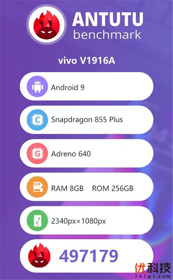 不仅如此,iQOO Pro安兔兔跑分画面也在网络上曝光。从截图涵盖的信息我们可以看到,iQOO Pro强悍的硬件配置在安兔兔里跑出了497179的高分,非常接近50万分。我们完全有理由相信,iQOO的产品经理们在说出“同样是骁龙855 Plus处理器,有的快、有的则更快”这句话时,是如何的自信满满。