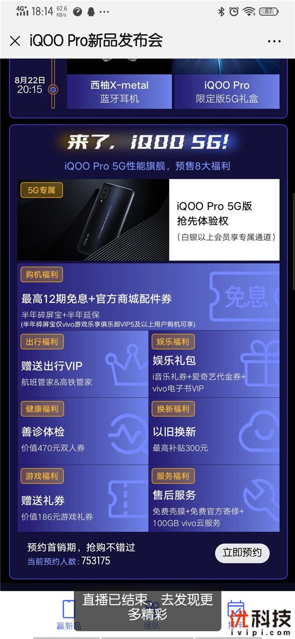 发布会当晚9:00,iQOO Pro 4G版在vivo官网、vivo京东自营官方旗舰店、京东vivo官方旗舰店、天猫vivo官方旗舰店、vivo苏宁自营旗舰店、vivo体验店专卖店同步开启预售;8月29日0:00正式开售。而大家最期待的iQOO Pro 5G版, 8月23日0:00在各大平台限量抢先预售,8月29号0:00在线上线下同步开启预售,9月2号0:00正式开售。