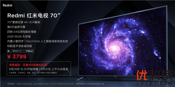 8月29日下午, Redmi红米电视70英寸开启预约/预售,9月10日10点正式开售,同步登陆小米商城、小米有品、京东、天猫、苏宁易购。值得一提的是,此轮首卖预售还为米粉准备了特享福利:订金100元抵500元,这意味着Redmi红米电视70英寸的首卖到手价仅为3399元。相信这款性价比爆表的巨屏电视,将掀起一场巨屏电视普及风暴。