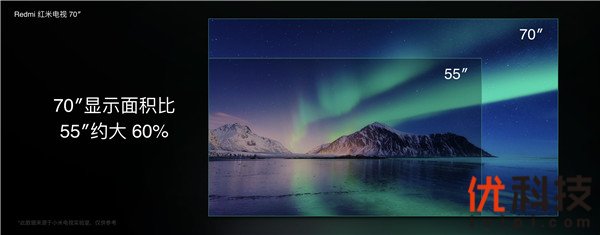 “同样的钱买更大的!” 卢伟冰表示。因此,Redmi红米电视首款产品便采用70英寸4K超高清巨屏设计,其显示面积比目前的主流尺寸55英寸大出约60%,巨大的视野为用户带来更震撼的沉浸感。