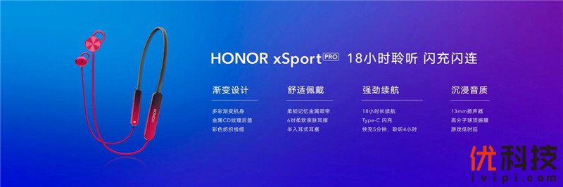 此次发布会上,荣耀xSport PRO运动蓝牙耳机也正式亮相,其采用记忆金属材质劲戴式设计,让运动佩戴更加稳固舒适。同时,该机采用120mAh大容量锂电池以及低功耗蓝牙芯片,续航时间长达18小时;耳机线控内置的Type-C接口,支持HUAWEI HiPair闪充闪连技术,可通过接入手机快捷充电,并完成蓝牙配对。荣耀xSport PRO运动蓝牙耳机提供魅焰红、海鸥灰、星云紫三种潮流时尚配色,售价399元。