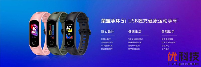 荣耀手环5i也正式亮相。荣耀手环5i加入了便捷的USB即插即充设计,拆下表带即可插入USB口充电。同时,该产品还保留了荣耀手环5特有的血氧检测功能,并支持智能心率监测、科学睡眠监测、9项运动模式、移动支付等,配色方面提供陨石黑、珊瑚粉、橄榄绿三色可选,售价159元。