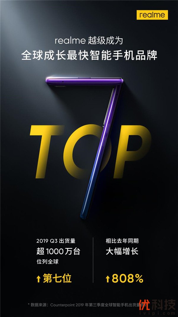 2019年10月28日,市场研究机构Counterpoint发布2019年第三季度全球智能手机出货量统计数据,凭借着超过1000万台的成绩,realme在2019年第三季度全球智能手机出货量排行榜中位列第七。这也是自2019年第二季度正式进入全球智能手机出货量前十之后,realme首次进入全球前七。值得一提的是,与去年同期相比,realme在第三季度的增长率高达808%,位列全球第一,成为全球成长最快智能手机品牌。