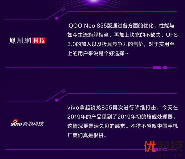iQOO Neo 855版另外一大卖点就是33W闪充和4500mAh超大电池组合,只需10分钟即可充入4500mAh超大电池的25%,而4500mAh超大电池则可以持续看抖音12.5小时,玩王者荣耀(高帧率)7.14 小时,听90小时歌曲,真正实现了回血迅速、续航持久[1整体数据源于 vivo 实验室测试数据]1,彻底解决用户的电量焦虑症。对于iQOO Neo 855版的具体表现,媒体口碑多集中在“真香”、“性能强悍”、“标杆”、“跑分王”、“全面”等关键词,足可见这款“855新王牌”的强悍实力。