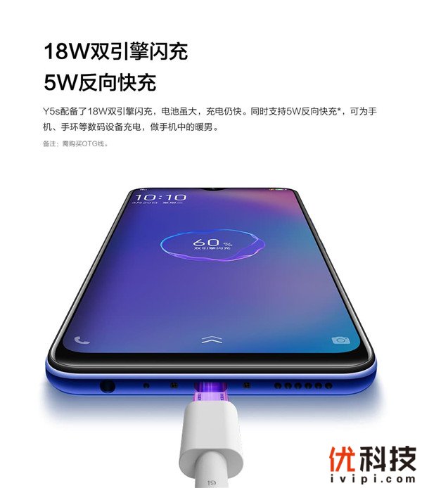在充电上,vivo Y5s配备了18W双引擎闪充,即使是5000mAh超大容量电池,也能拥有不错的充电体验,在没电时能够快速恢复电量。此外,vivo Y5s还支持5V/1A反向快充,在身边智能设备没电时,能够化身临时充电宝,为智能设备充电。