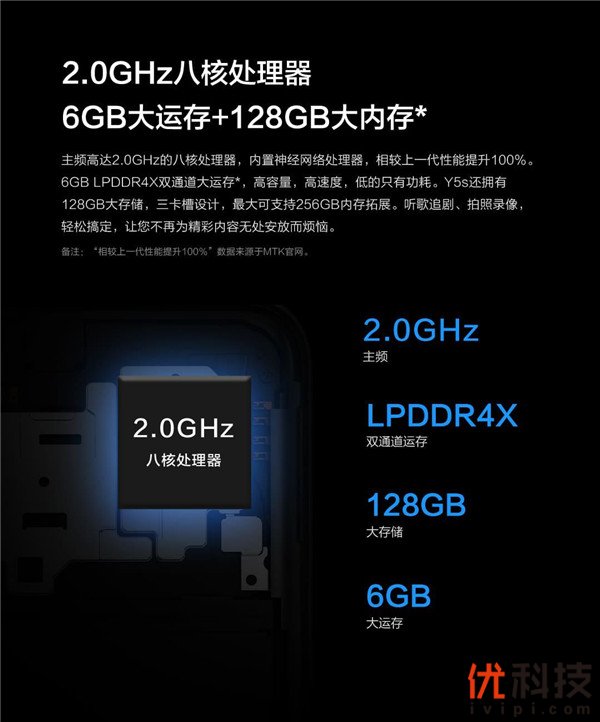 在超能续航的基础上,vivo Y5s还为手机的流畅运行打造了强劲的配置。vivo Y5s搭载了最高主频达2.0GHz的八核处理器,性能比上一代提升了100%;内置神经网络处理器,能够为AI处理提供性能保障。