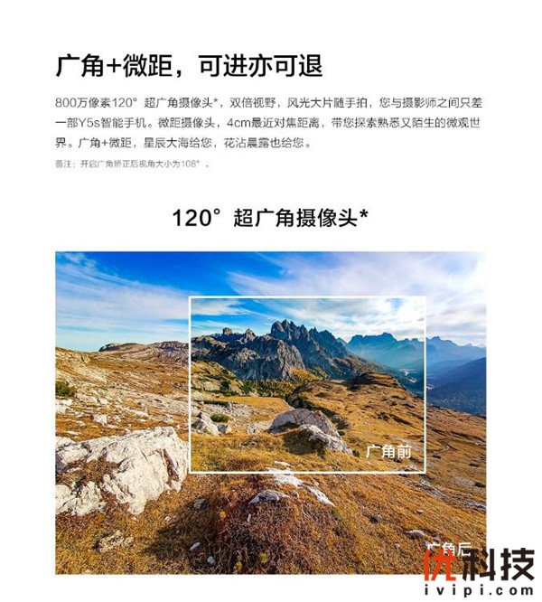 除了超能续航,焕颜拍摄是vivo Y5s的另一大特点。vivo Y5s配备了1600万像素的AI智慧三摄,集成了广角、景深和微距功能,能够适应多种视角的拍摄需求。vivo Y5s主摄像头拥有1600万像素,能够记录画面中更多的细节;而800万像素的超广角镜头,拥有120°的拍照视野,能够容纳更多的画面;200万像素的微距镜头,则能够记录不一样的微观世界。