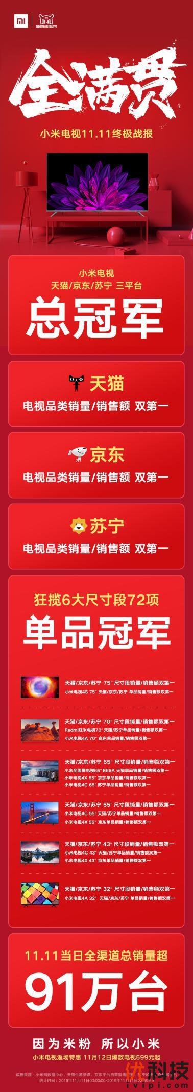 小米电视双11电商大战“全满贯”:席卷三大平台72项冠军!