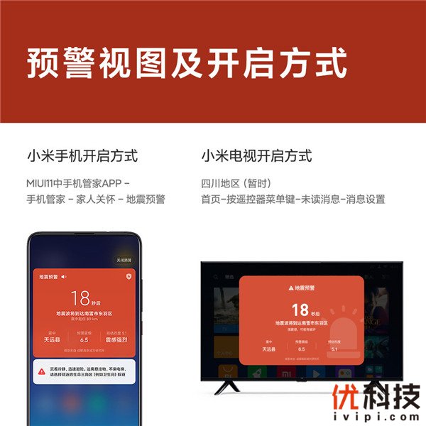 今年6月17日,四川长宁地震使地震预警功能走入公众视野,小米公司了解后立刻联系减灾所商讨合作。9月小米发布的MIUI11中便已包含地震预警功能,小米电视随后跟进。功能上线后,小米手机和电视已成功预警11月10日06:46的四川宜宾市兴文县4.1级地震,得到了用户和民众的高度肯定。目前,MIUI11已内置在所有新出厂的小米手机中,此前购买小米手机的用户可以自行升级操作系统到MIUI11,即可拥有地震预警功能。小米电视用户按照推送也可以自行升级。