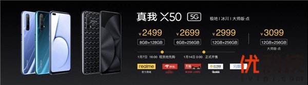 售价上,realme 真我X50 5G起步版本就配备128GB ROM。各版本的售价分别为2499元(8GB+128GB)、2699元(6GB+256GB)和2999元(12GB+256GB),超越预期的价格让这款产品更值得用户选择,可以说是一款喜闻乐见的5G青年旗舰!realme 真我X50大师版(12GB+256GB)售价则为3099元,深泽直人亲自操刀,让产品更具魅力。