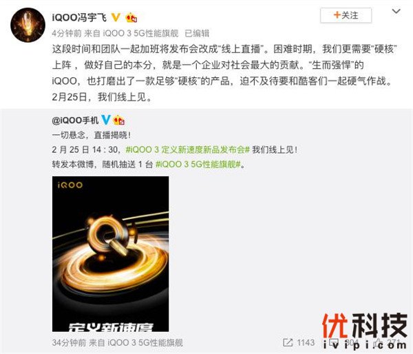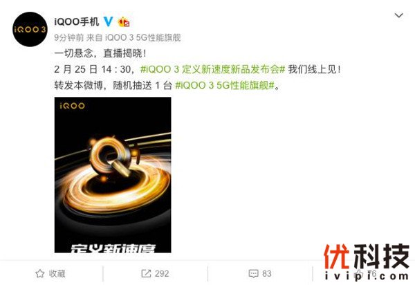 继昨天iQOO官方微博放出iQOO 3即将发布的消息后,今天官博再次跟进iQOO 3发布会的相关信息:iQOO 3新品发布会将于2月25日下午14:30举办,发布会主题为“定义新速度”。这是在强调iQOO 3定位5G性能旗舰后,再次强调“速度”这一关键词,iQOO 3的卓越性能不禁让人产生遐想。这条消息得到iQOO品牌副总裁冯宇飞个人微博的转发确认。